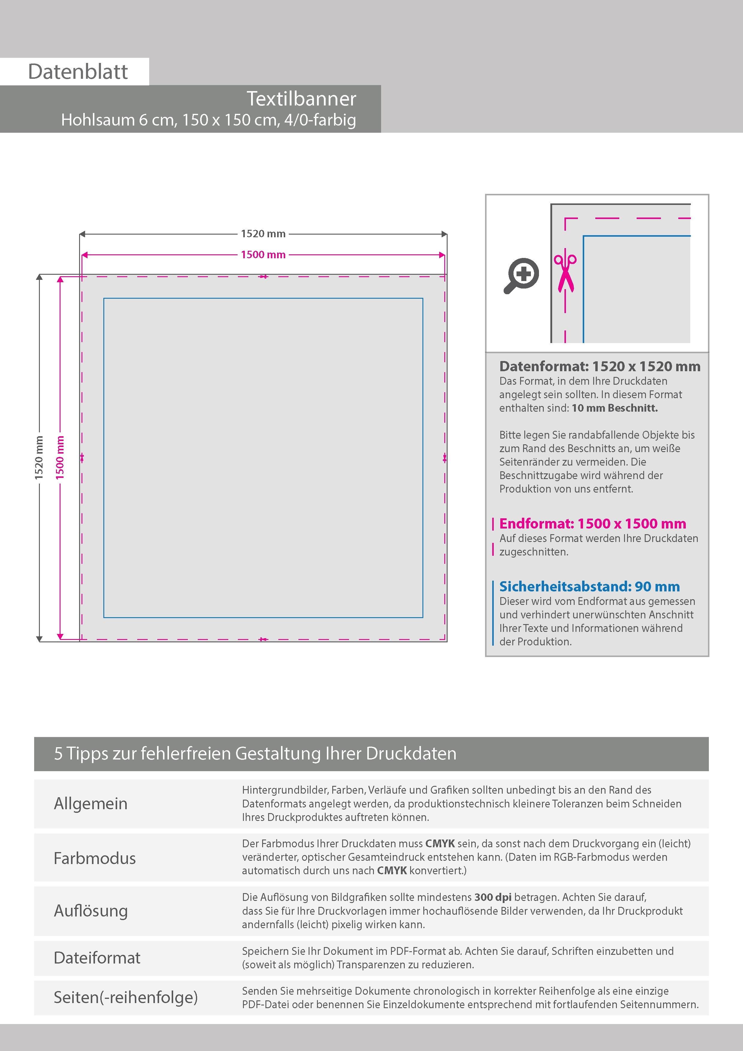 Hochwertige Stoff-Banner 150 x 150 cm, 4/0-farbig bedruckt, Hohlsaum links und rechts (Durchmesser Hohlsaum 6,0 cm)