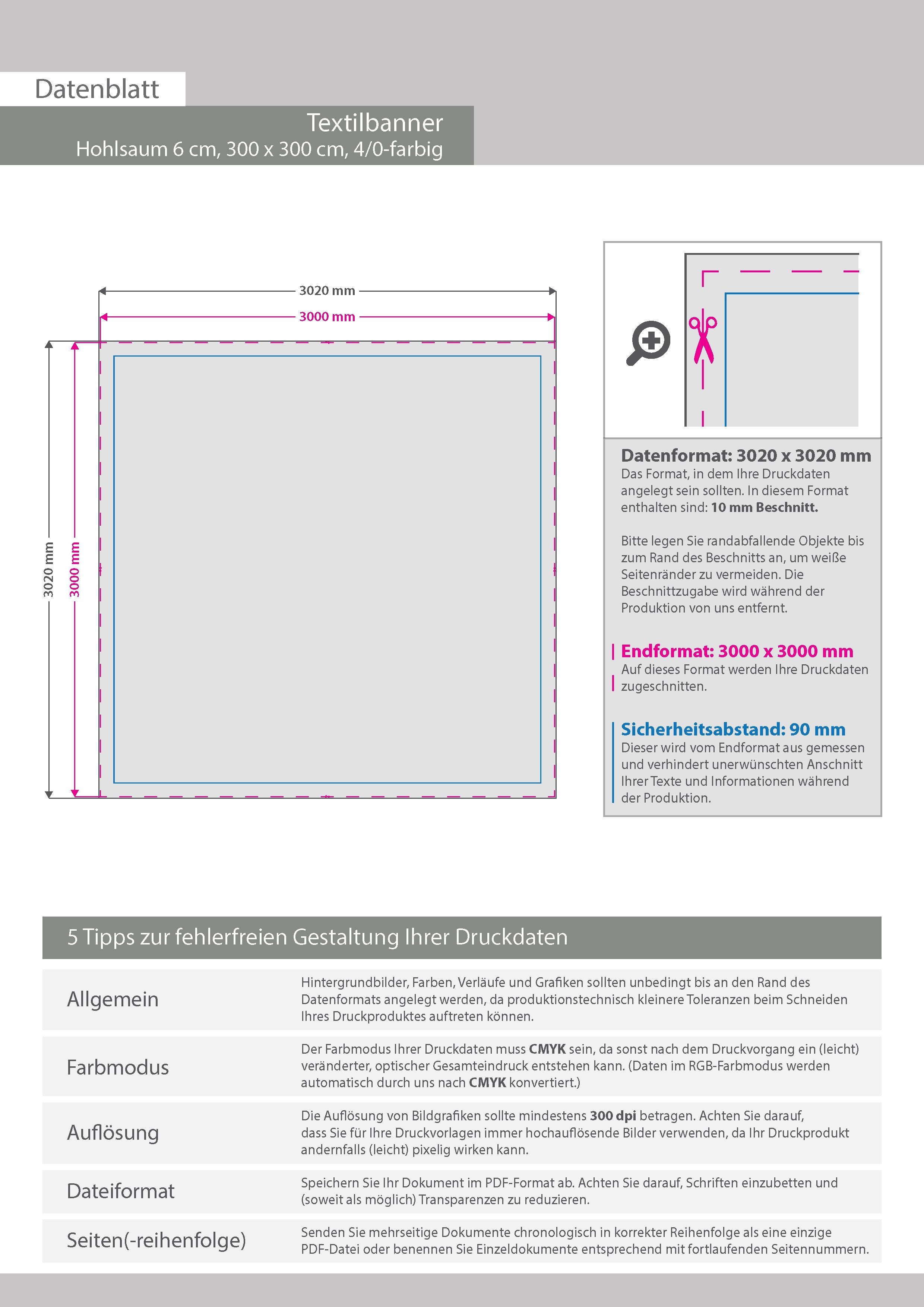 Hochwertige Stoff-Banner 300 x 300 cm, 4/0-farbig bedruckt, Hohlsaum links und rechts (Durchmesser Hohlsaum 6,0 cm)
