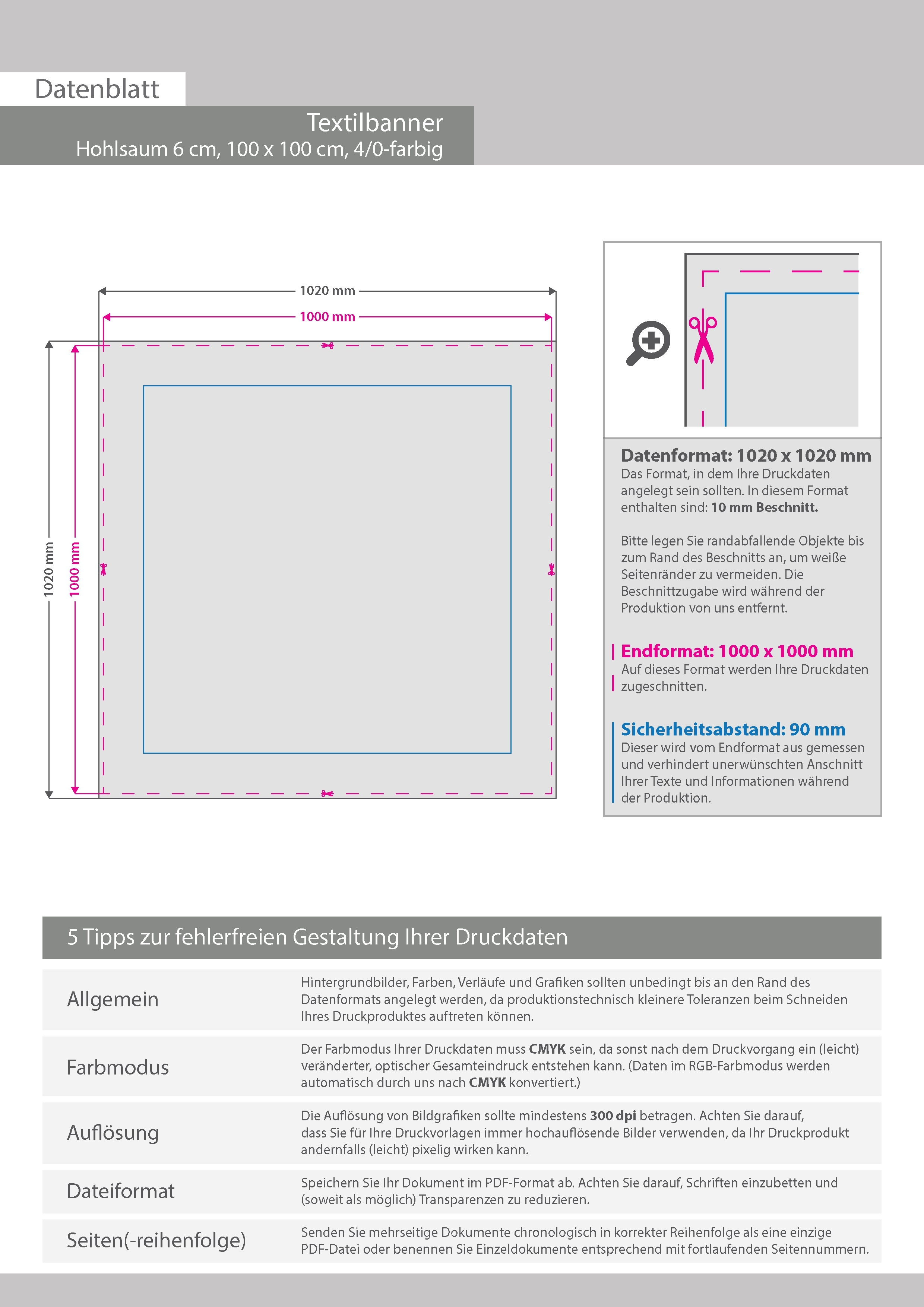 Hochwertige Stoff-Banner 100 x 100 cm, 4/0-farbig bedruckt, Hohlsaum oben und unten (Durchmesser Hohlsaum 6,0 cm)