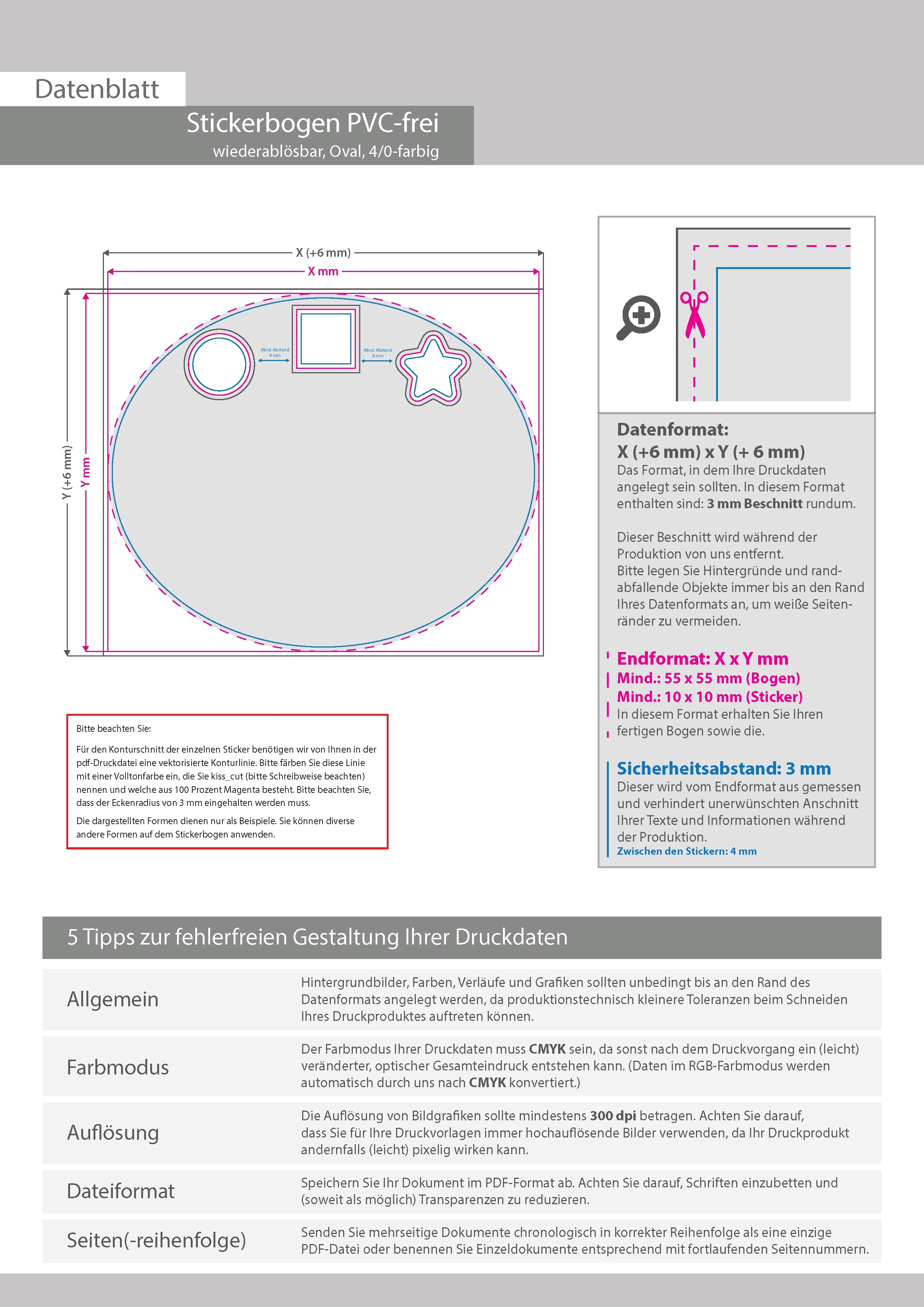 Stickerbogen wiederablösbar PVC-frei, 4/0 farbig bedruckt oval (oval konturgeschnitten)