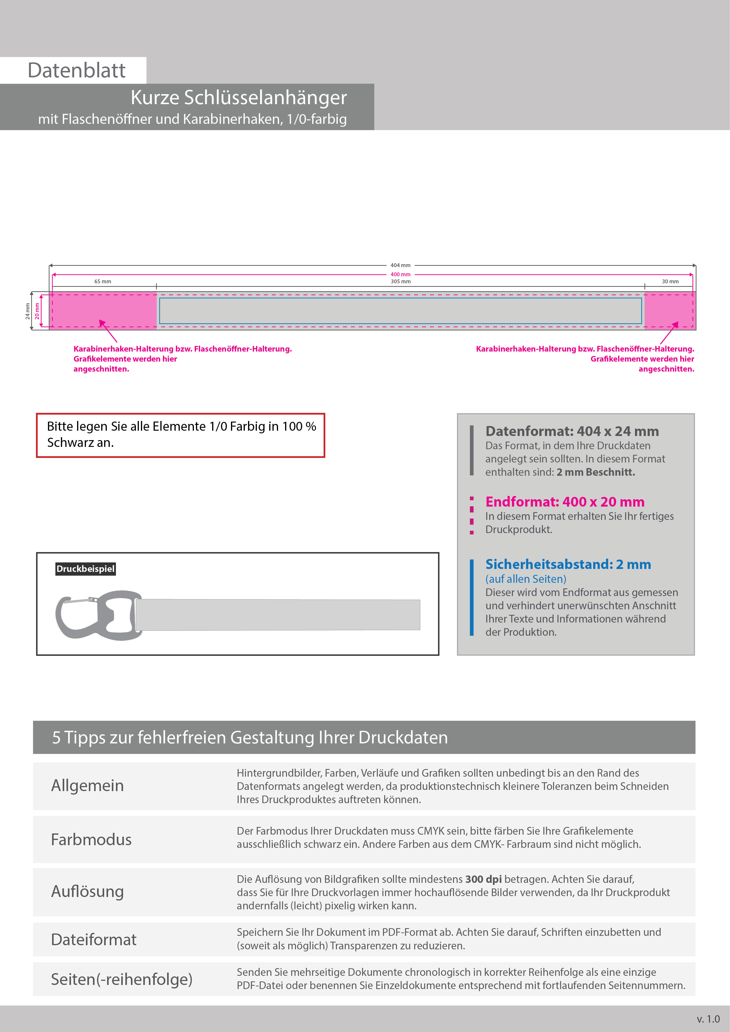 Kurze Neon Schlüsselanhänger mit Flaschenöffner und Karabinerhaken, 20 mm Schlüsselbandbreite, 1/0 farbig einseitig bedruckt (vorne schwarz)