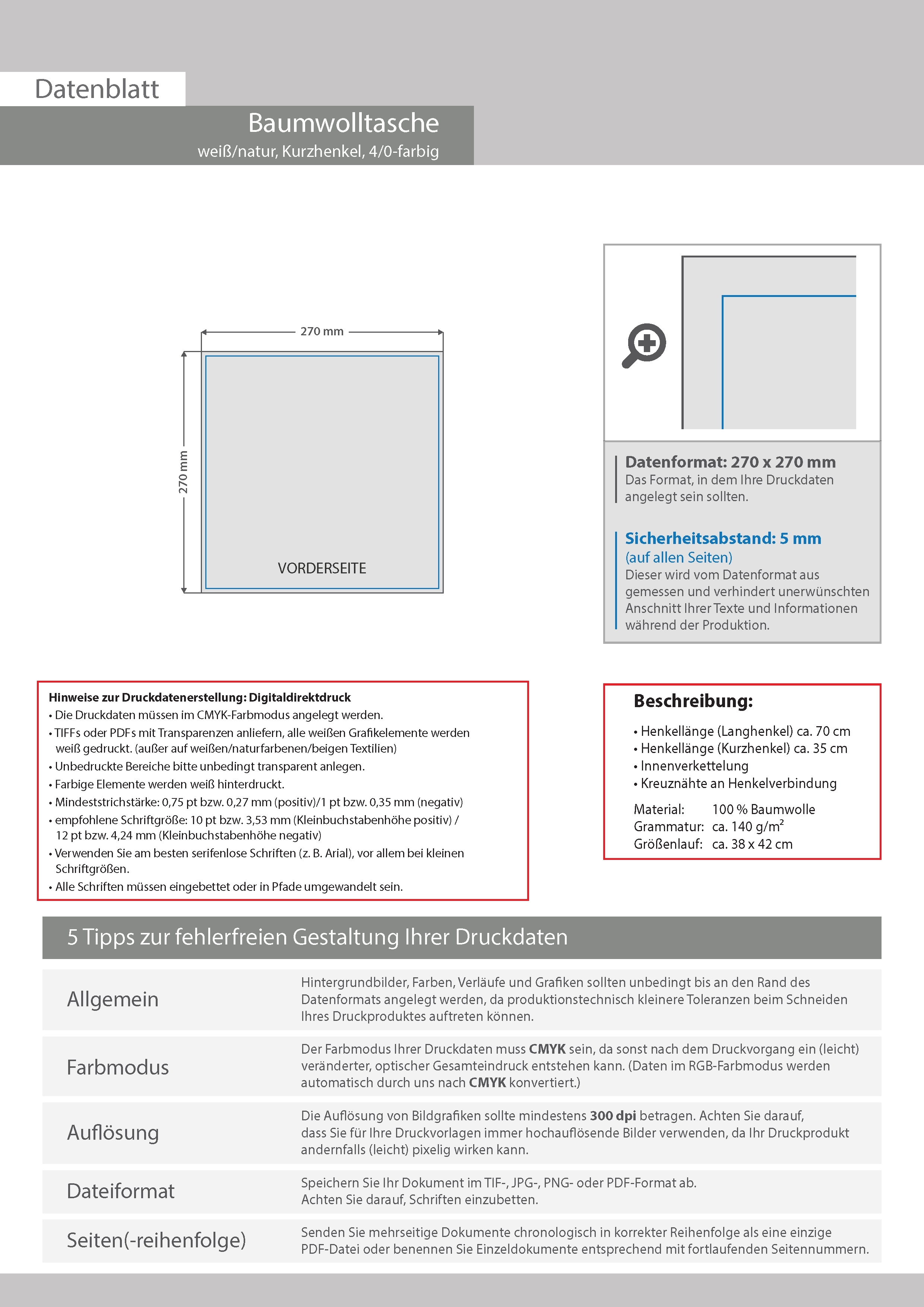 Baumwolltasche weiß/natur, Kurzhenkel - 4/0-farbig, einseitig bedruckt